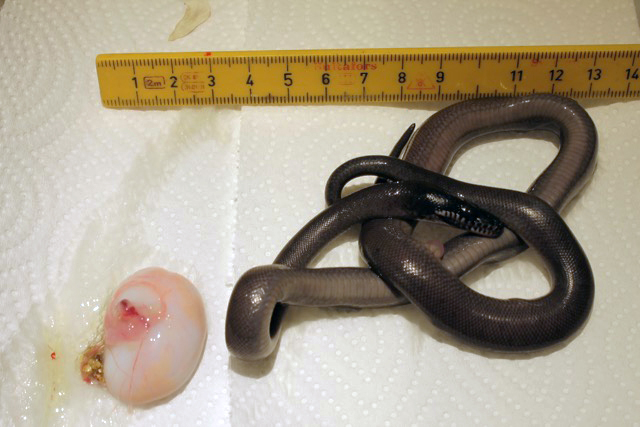 After removing the baby it could be seen that the umbilical chord had wrapped itself tightly around the baby snakes body. This probably played a role in the baby's death.