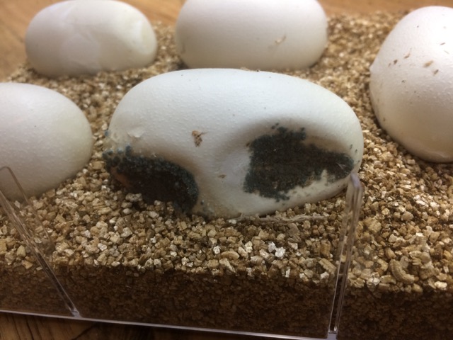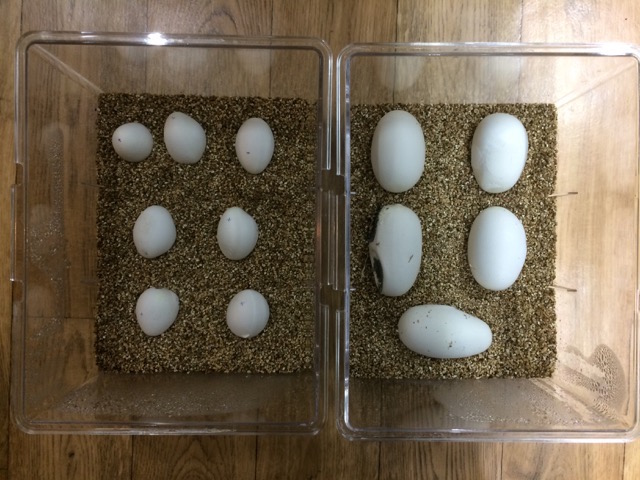 The six good eggs were placed into two incubator boxes (3 eggs each box) on damp vermiculite and placed in the incubator at 30.5C.